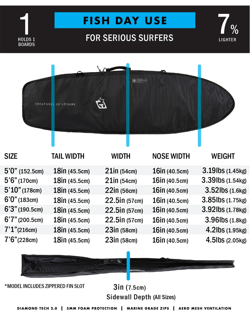 The Creatures Fish Day Use Boardcovers are designed for day-to-day usage with single board capacity for wider fun boards. Our Day Use Boardcovers use premium DIAMOND-TECH® materials and superior construction to ensure your boards get to the beach and back intact.