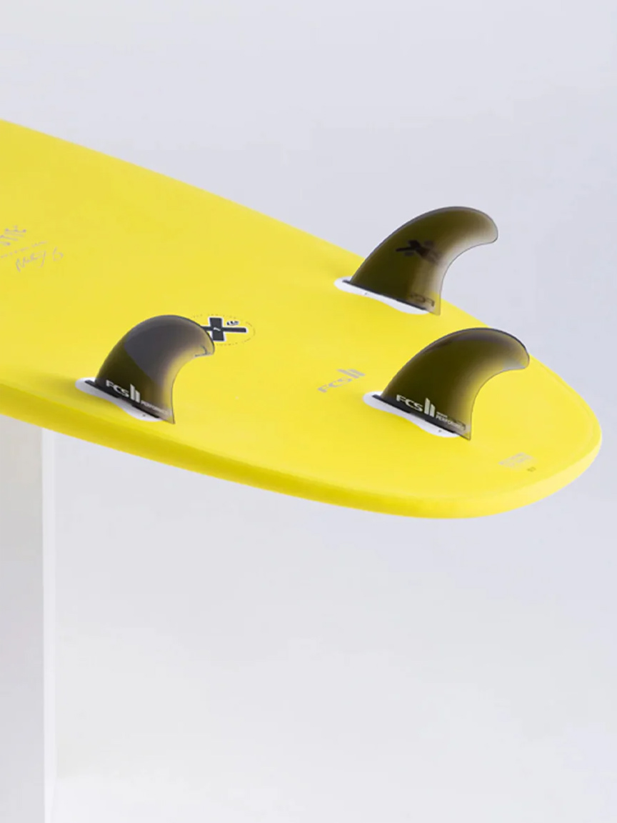 Construction: Super EVA, lightweight with textured skin Rocker: Med Fin System: FCSII/Futures – Thruster Fin Supplied: Thruster FSCII Softflex, F8 Safety Bottom Contours: Single to double Outline: Wide Round Tail