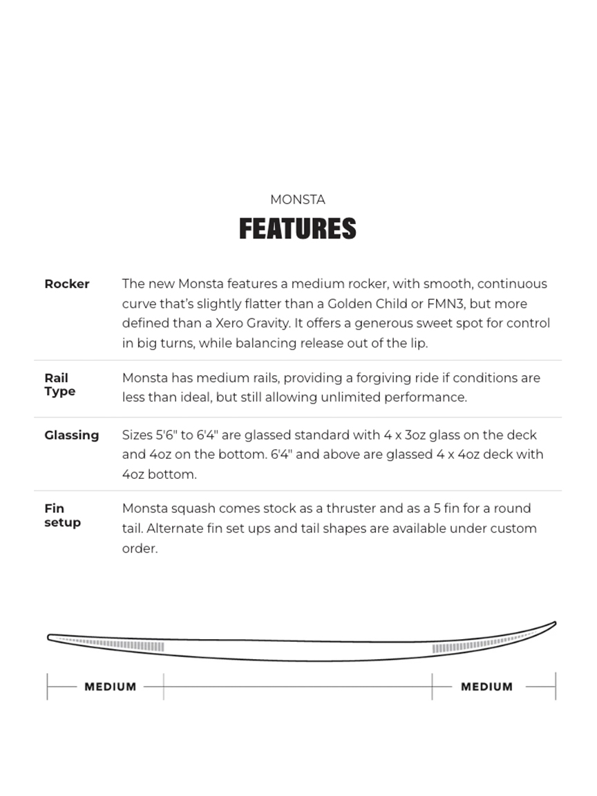 In a similar range of conditions, the Xero Gravity is the everyman’s daily board, forgiving yet still performance oriented with a flatter deck & fuller rail, while the Monsta will dominate the same type of waves in a more refined version for the fitter or more experienced surfers. Overall, the new Monsta has a medium rocker, with smooth, continuous curve that’s slightly flatter than a Golden Child or FMN3, but more curve than a Xero Gravity. It features a generous sweet spot for control in big turns, while balancing release out of the lip.