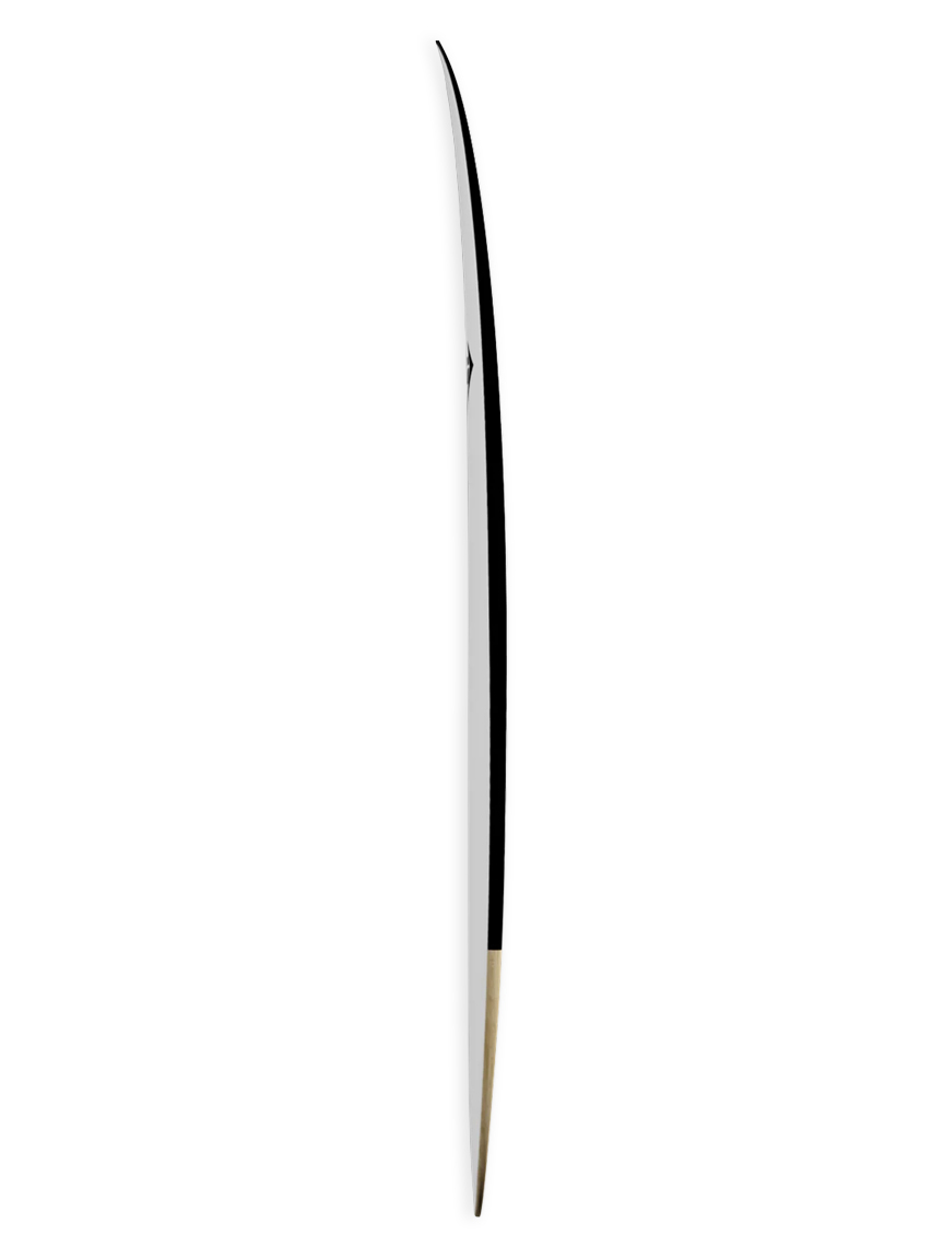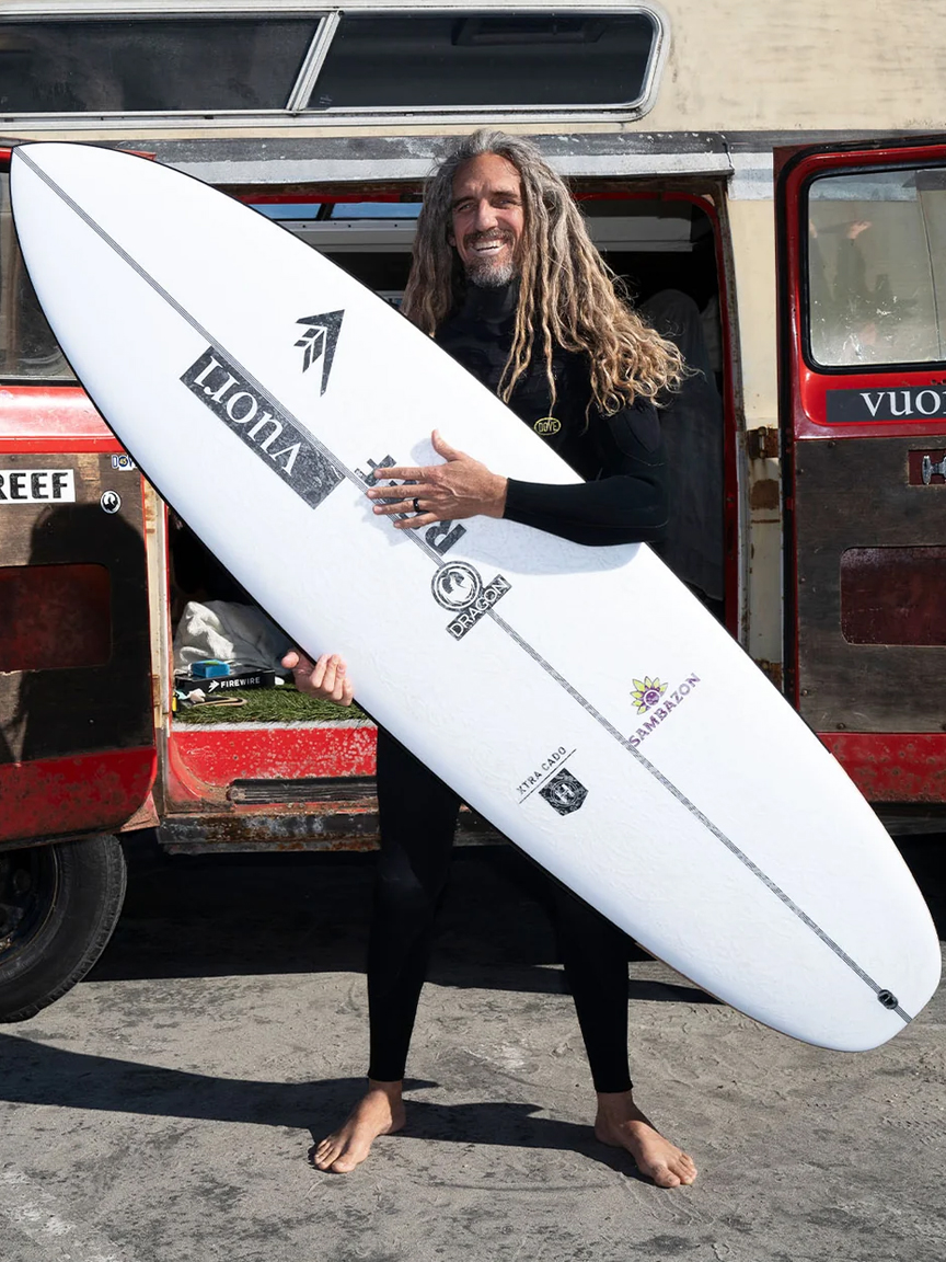 Rob started with his best-selling Machadocado, and stretched out the outline to its midlength form, which made it much straighter creating a reallyglidey and floaty shape that’s easy to ride. He pulled down the rail from the domed deck giving the shape plenty of performance, and double concave with see running down the middle, making the board really user-friendly and easy to ride. The wide squash is super thinly foiled, just like Rob’s Machadocado. This design is really responsive rail-to-rail, great for long drawn-out turns, but also whips really tight in the pocket and in tight places on the wave face.